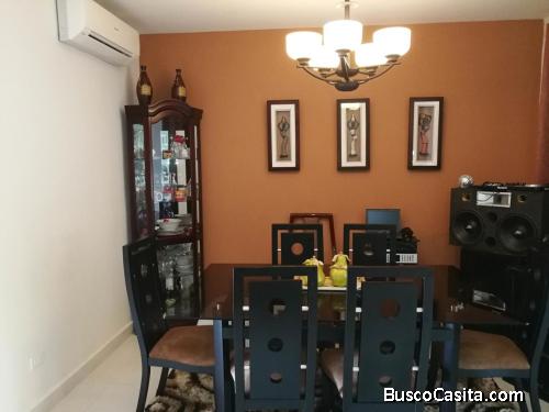 Cuenta con Aire en todas las habitaciones, sala y cocina, lavadora, secadoras, estufa empotrada, refrigeradora, agua caliente, muebles de sala, cocina y comedor, tres recamaras dos baños en planta alta y uno de visita en planta baja. centro de recreación, piscina, cancha de Futbol, basquetbol, tenis y Gym. dos estacionamiento bajo techo, seguridad las 24 horas.